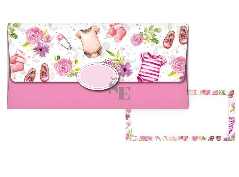 Dárková obálka na peníze s motivem pro miminka (holčičky). Udělejte novopečeným rodičům radost a věnujte jim obálku s penězi. Uvnitř je kartička bez textu, na kterou můžete napsat věnování.