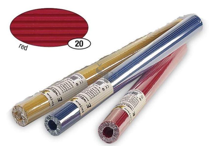 Barevná lepenka v roli. Plošná hmotnost 260 g/m2. Druh vlnění E-Welle (rovná vlna). Formát: 50 x 70 cm.