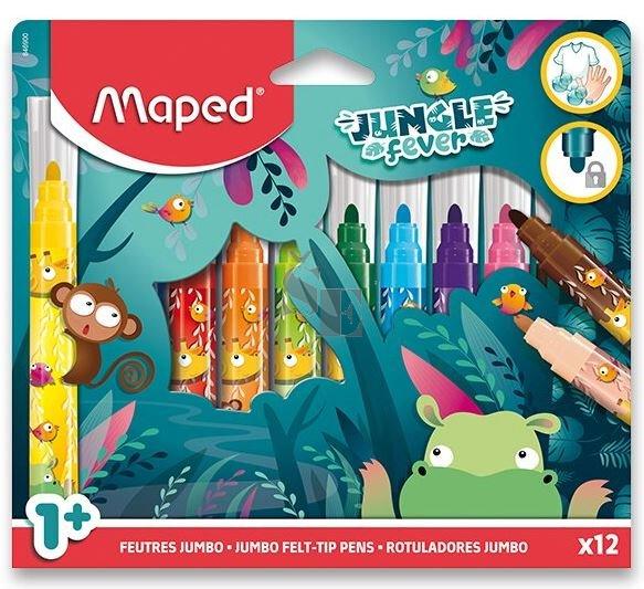 Souprava barevných fixů Maped Jumbo Jungle Fever s motivy zvířátek z džungle. Fixy jsou se silným hrotem speciálně navržené pro děti již od 1 roku. Snadno vypratelný a omyvatelný inkoust. Zářivé barvy. Hrot odolný proti zatlačení či poškození, účinný uzávěr. Dlouhá životnost.