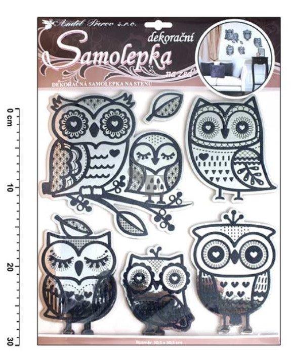Samolepky na zeď sovy se zrcadlovým efektem a černou glitrovou konturou 40x31cm