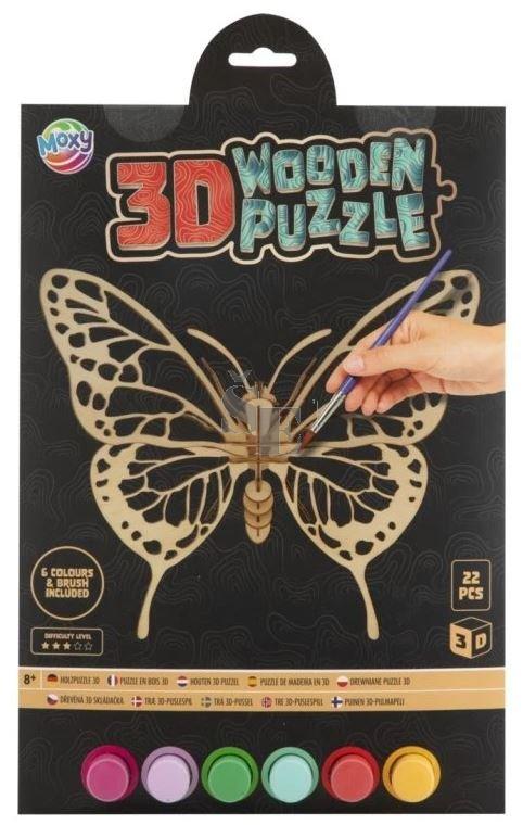 Dřevěná skládačka motýl 22 dílků a 6 akrylových barev. Sestavte si z jednotlivých dřevěných dílků motýla a poté vybarvěte přiloženými barvami. Tato kreativní hračka rozvíjí šikovnost a jemnou motoriku vašich dětí. Vhodné pro děti od 8 let, ale i přesto doporučujeme dohled dospělé osoby a pomoc při sestavování.