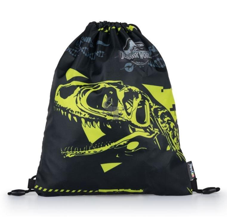 Sáček na přezůvky s motivem Jurského světa. Uzavírání stažením šňůrek, možnost nosit i na zádech nebo připevnit ke školnímu batohu. Materiál 100% polyester.