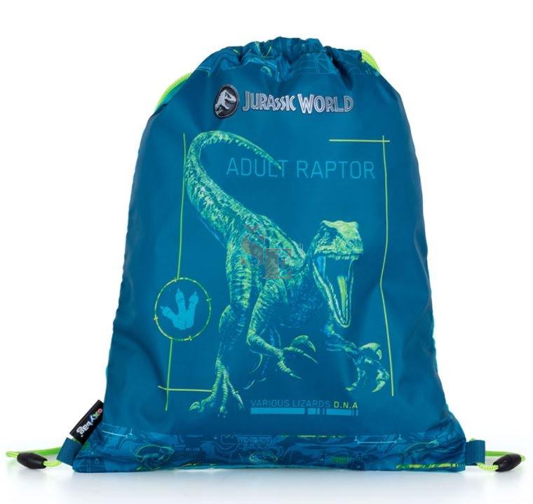 Sáček na přezůvky s motivem Jurského světa. Uzavírání stažením šňůrek, možnost nosit i na zádech nebo připevnit ke školnímu batohu. Materiál 100% polyester.