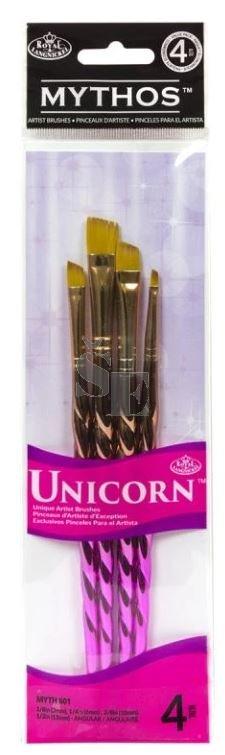 Tato sada 4 štětců s rukojetí má kovovou povrchovou úpravu a víří roh jednorožce.
