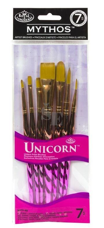 Tato sada 7 štětců s rukojetí má kovovou povrchovou úpravu a víří roh jednorožce.