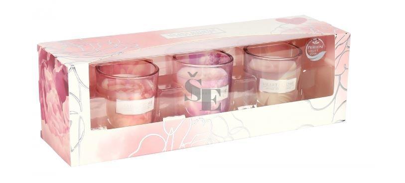 Sada obsahuje 3 mini svíčky ve vůních - Květinová harmonie, Oáza klidu, Dotek anděla.