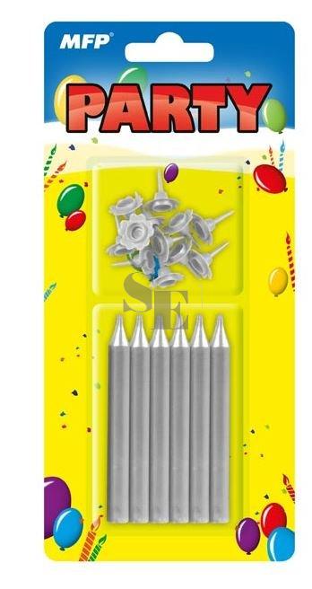 Sada dortových svíček o průměru 0,74cm a výšce 7,8cm, set obsahuje 12 kusů svíček ve stříbrném provedení a 12 kusů plastových držáků na svíčky.