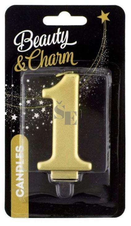 Zlatá, metalická, dortová svíčka ve tvaru číslice.