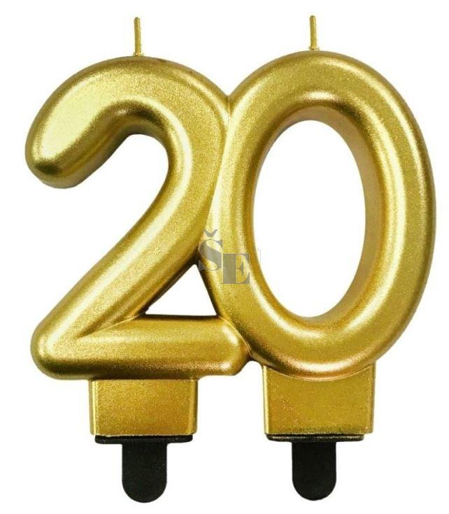Zlatá, metalická, dortová svíčka ve tvaru číslice.
