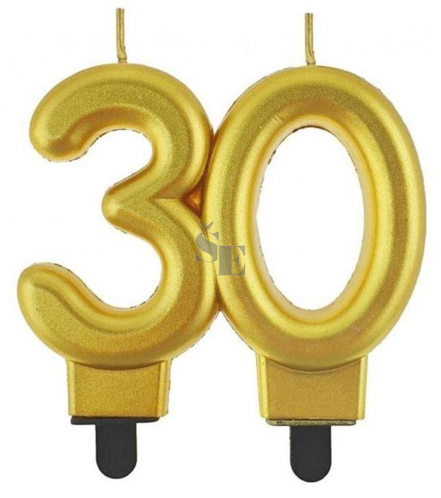 Zlatá, metalická, dortová svíčka ve tvaru číslice.