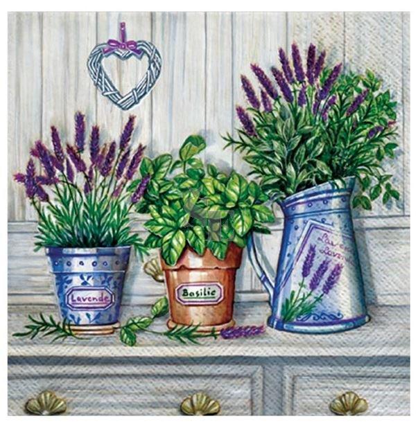 Prostírání s vůní venkova. Ubrousek s motivem levandule a bazalky v květináčích a džbánu přinese na váš stůl atmosféru provensálské kuchyně a letních dnů. Jemně laděné barvy a rustikální pozadí vytvářejí harmonii, která působí svěže a útulně.