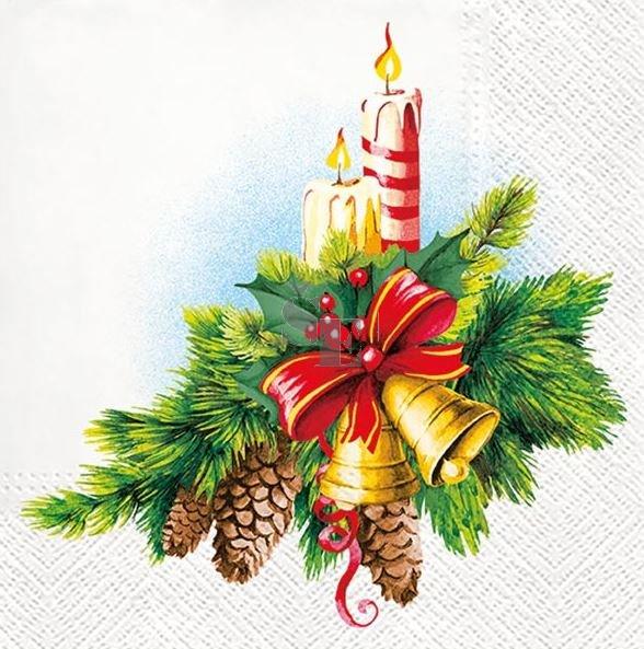 Papírový vánoční ubrousek s motivem vánočního svícnu z větviček jehličí a šišek, ozdobený zlatými zvonky s červenou mašlí a dvěma svíčkami. Je vyroben z velmi kvalitního třívrstvého papíru. Tento ubrousek se hodí pro vánoční slavnosti, kde jeho tradiční symboly a barevná kombinace přispějí k vytvoření příjemné a hřejivé atmosféry na slavnostně prostřeném stole.