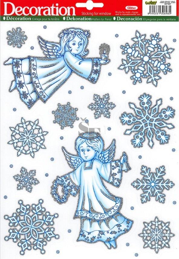 Modrá vánoční dekorace na okna s glitry bez lepidla.