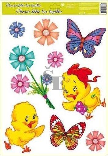 Okenní fólie bez lepidla s motivy květin, motýlků a kuřátek.