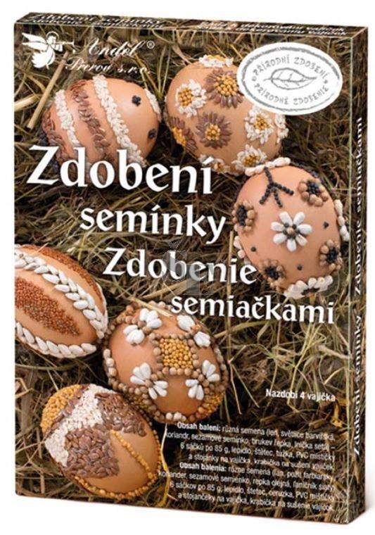 různá semena (len, světlice barvířská, koriandr, sezamové semínko, brukev řepka, lnička setá) - 6 sáčků po 85 g, lepidlo, štětec, tužka, PVC mističky a stojánky na vajíčka, krabička na sušení vajíček.