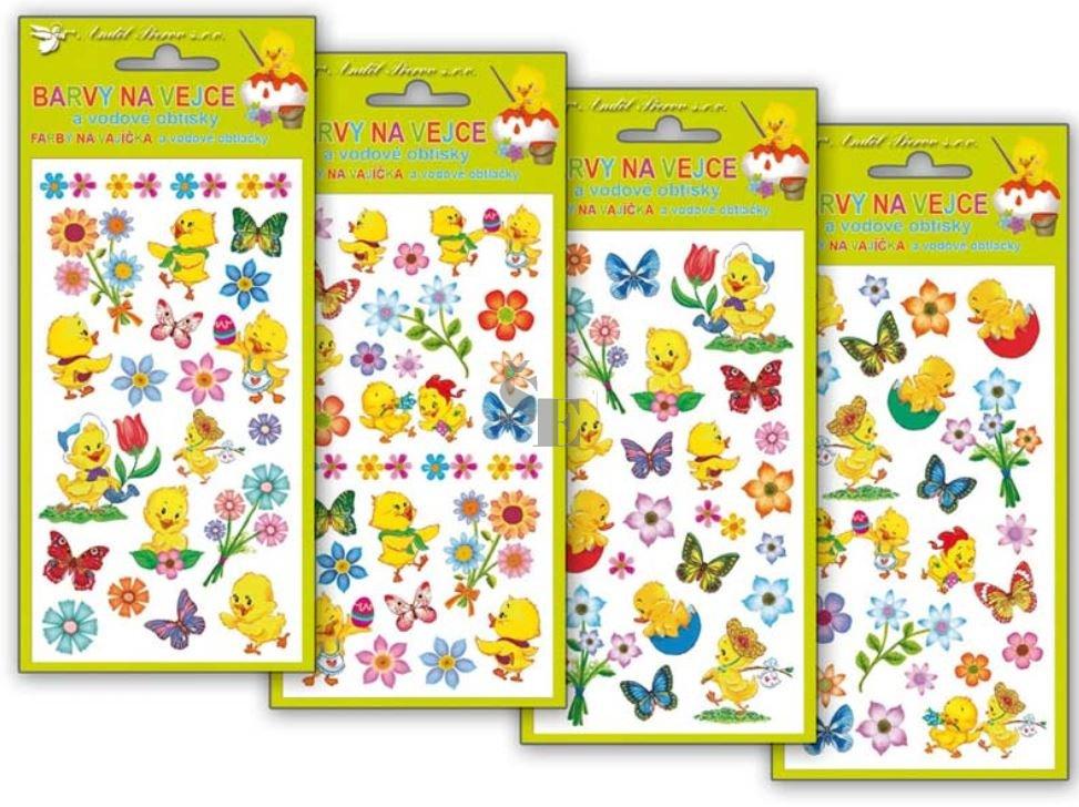Balení obsahuje 4 ks po 5 g práškové barvy (žlutá, oranžová, červená, zelená) a velikonoční vodové obtisky.
