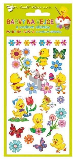 Balení obsahuje 4 ks po 5 g práškové barvy (žlutá, oranžová, červená, zelená) a velikonoční vodové obtisky.