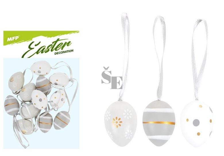 - 12 ks šedých a bílých plastových vajíček s malovanými motivy v bílé a šedé barvě - vajíčka mají provázek na pověšení.