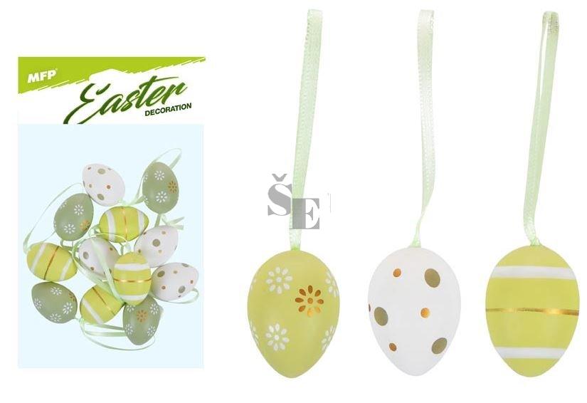 - 12 ks zelených plastových vajíček s malovanými motivy v zelených odstínech - vajíčka mají provázek na pověšení.