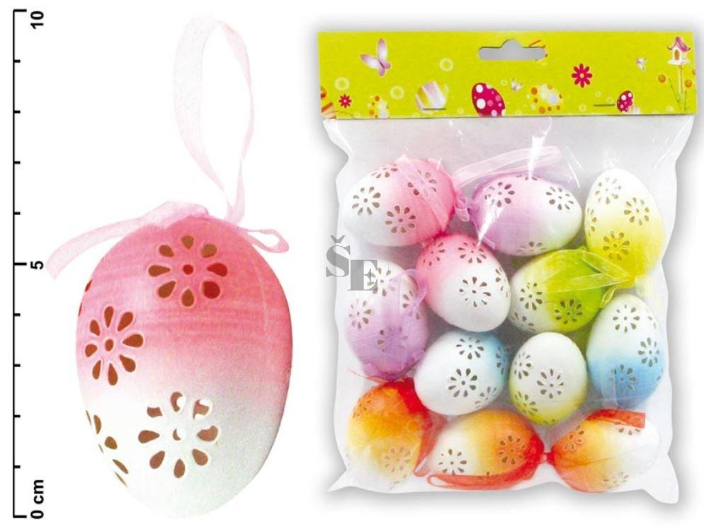 Balení obsahuje 12 ks plastových velikonočních vajíček. Vajíčka jsou zdobena dírkami ve tvaru květu