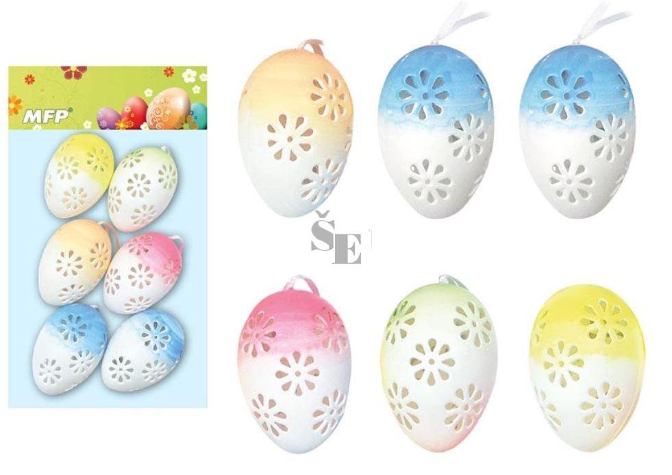6 ks plastových vajíček v žluto-bílo-zelené kombinaci, vajíčka mají šňůrku na pověšení