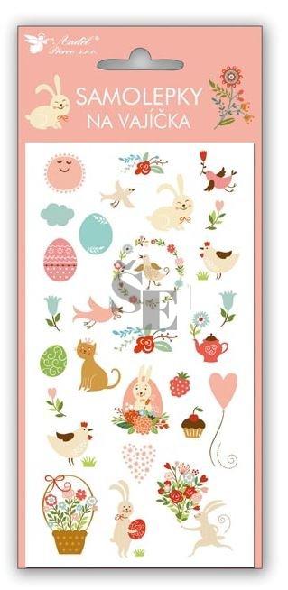 Samolepky na velikonoční vajíčka, na kterých jsou vyobrazeny obrázky velikonočních vajíček, kuřátek, oveček, ptáčků a dalších jarních a velikonočních motivů. (ve 4 provedeních)