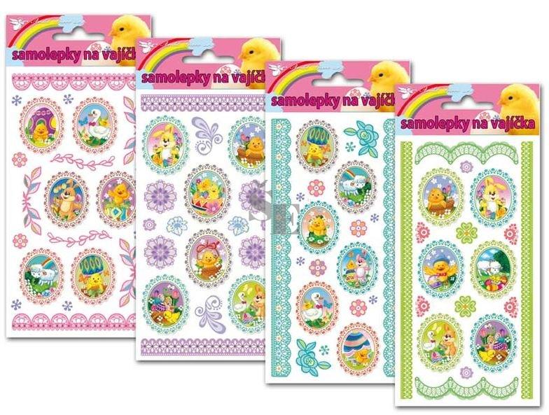 Samolepky na vajíčka velikonočními motivy beránků, kuřátek, zajíčků, a dalších symbolů velikonoc a jara.