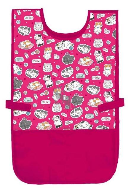 Dětská zástěra s motivemn kočiček. Po stranách má dvě pozice zapínání na druky, které umožňují přizpůsobení velikosti zástěry podle potřeby. Oblékání přes hlavu je jednoduché a rychlé, což je pohodlné pro malé děti, které mohou zástěru snadno obléknout a svléknout samy. V dolní části zástěry jsou praktické kapsy. Perfektní pro hodiny výtvarné výchovy, domácí tvoření i pomoc v kuchyni. Zástěra je snadno omyvatelná.